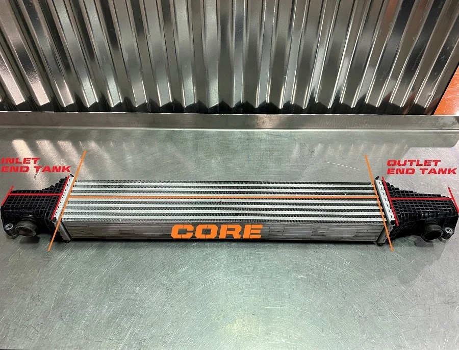 In layman terms, the boosted air leaving your turbocharger goes into the end tank where it hugs the outside of the tank before going into the core. Despite having a core “x” thick, only the outer ⅓ of it (green colors) does most of the work. That’s not optimal! Why only use ⅓ of something? Let's fix that.